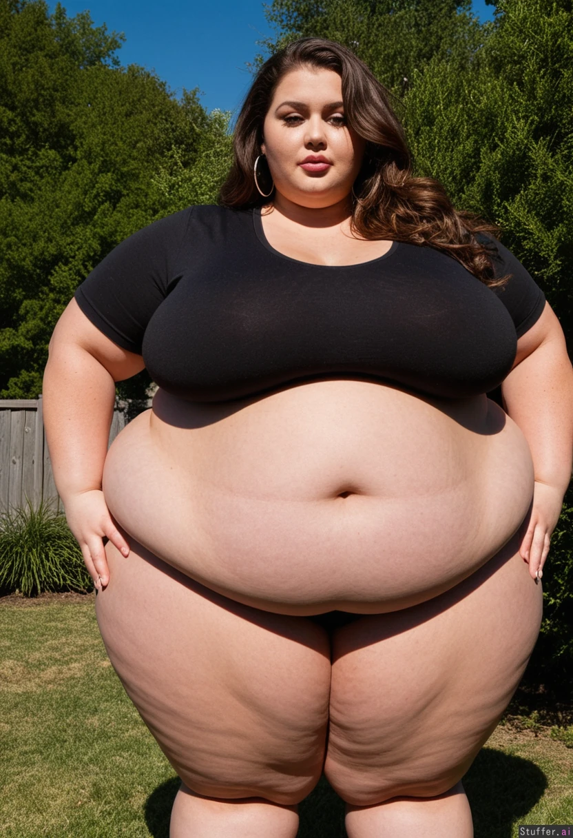 Silver hoops earrings Standing outside sunny day Black v_neck t-shirt Black thong ((Toned waist)) (((Wavy brown hair))) (((((Extra_Wide extra_thick supersized full overfed enormous rotund massive hips))))) (((((Bulging supersized immense massive hips)))))