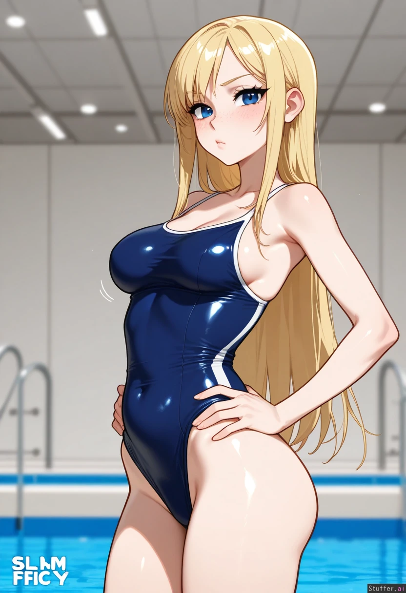 hdr, c.cu, blushyspicy, betterwithsalt:1.4, best quality, anime, beautiful, intricate details, pewbutt(artist), masterpiece, beautiful 8k, high resolution, maximum pixel density, masterpiece, (((highly detailed))), ((flawless)), (((high rating))), ((highly detailed face)), full resolution, 8k, high resolution, best quality, 1woman, milf, detailed eyes, ((solo)) Appearance: Long straight blonde hair, blue eyes, pale skin, freckles, blushing, anime-woman, sexy expression, pouting, hands on hips, Outfit: blue one piece swimsuit Location: at the pool (posing in pool), side-view, looking at viewer Modifiers: (Slim figure:1.8), (chubby belly:1.0), (morbidly obese ssbbw figure:1.0), voluptuous, (weight gain), (Modest breasts:0.75), (breast expansion), (Wide waist:1.0), (thick thighs:1.0), (wide hips:1.0),