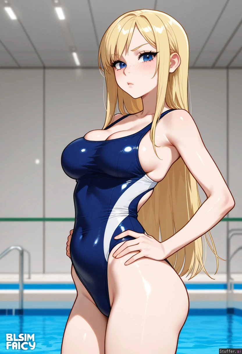 hdr, c.cu, blushyspicy, betterwithsalt:1.4, best quality, anime, beautiful, intricate details, pewbutt(artist), masterpiece, beautiful 8k, high resolution, maximum pixel density, masterpiece, (((highly detailed))), ((flawless)), (((high rating))), ((highly detailed face)), full resolution, 8k, high resolution, best quality, 1woman, milf, detailed eyes, ((solo)) Appearance: Long straight blonde hair, blue eyes, pale skin, freckles, blushing, anime-woman, sexy expression, pouting, hands on hips, Outfit: blue one piece swimsuit Location: at the pool (posing in pool), side-view, looking at viewer Modifiers: (Slim figure:1.75), (chubby belly:1.0), (morbidly obese ssbbw figure:1.0), voluptuous, (weight gain), (Modest breasts:0.8), (breast expansion), (Wide waist:1.0), (thick thighs:1.0), (wide hips:1.0),