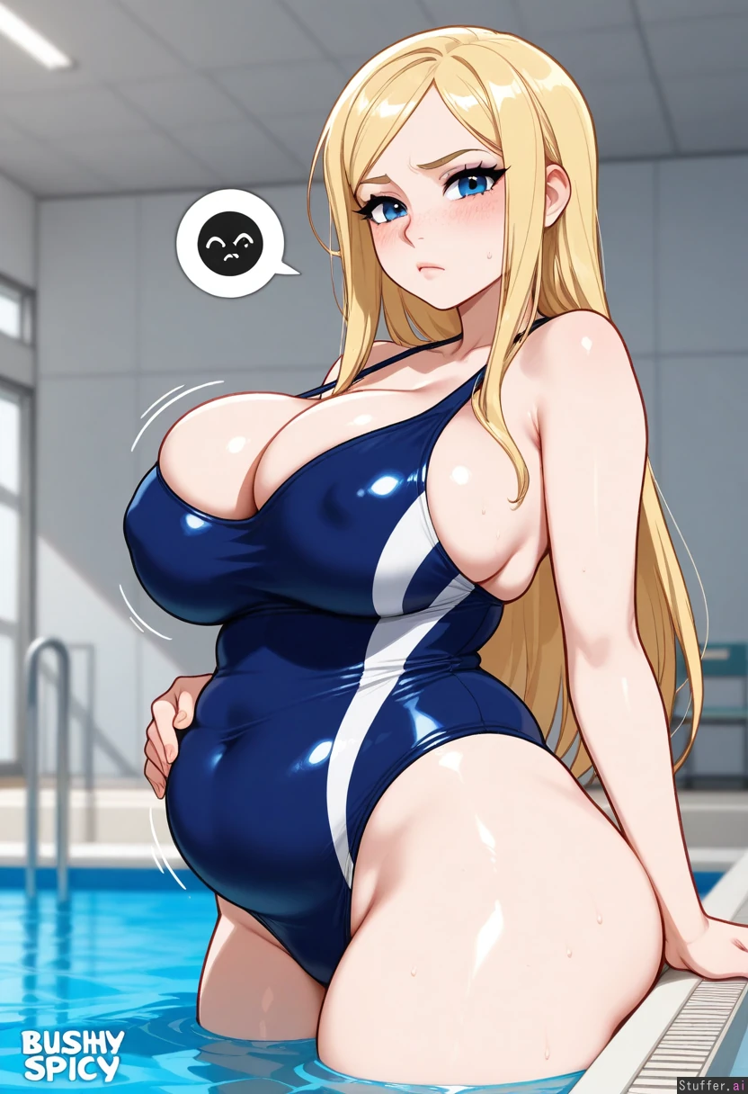 hdr, c.cu, blushyspicy, betterwithsalt:1.4, best quality, anime, beautiful, intricate details, pewbutt(artist), masterpiece, beautiful 8k, high resolution, maximum pixel density, masterpiece, (((highly detailed))), ((flawless)), (((high rating))), ((highly detailed face)), full resolution, 8k, high resolution, best quality, 1woman, milf, detailed eyes, ((solo)) Appearance: Long straight blonde hair, blue eyes, pale skin, freckles, blushing, anime-woman, sexy expression, pouting, Outfit: (very tight blue one piece swimsuit) Location: at the pool (posing in pool), side-view, looking at viewer, standing Modifiers: (Slim figure:1.35), (chubby belly:1.0), (morbidly obese ssbbw figure:1.05), voluptuous, (weight gain), chubby (Large breasts:0.9), (breast expansion), top heavy, erect nipples (Wide waist:1.0), (thick thighs:1.0), (wide hips:1.0), fupa