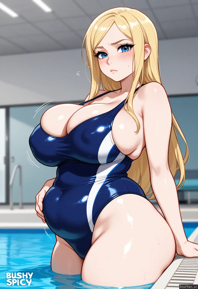 hdr, c.cu, blushyspicy, betterwithsalt:1.4, best quality, anime, beautiful, intricate details, pewbutt(artist), masterpiece, beautiful 8k, high resolution, maximum pixel density, masterpiece, (((highly detailed))), ((flawless)), (((high rating))), ((highly detailed face)), full resolution, 8k, high resolution, best quality, 1woman, milf, detailed eyes, ((solo)) Appearance: Long straight blonde hair, blue eyes, pale skin, freckles, blushing, anime-woman, sexy expression, pouting, Outfit: (very tight blue one piece swimsuit) Location: at the pool (posing in pool), side-view, looking at viewer, standing Modifiers: (Slim figure:1.3), (chubby belly:1.0), (morbidly obese ssbbw figure:1.05), voluptuous, (weight gain), chubby (Large breasts:1.0), (breast expansion), top heavy, erect nipples (Wide waist:1.0), (thick thighs:1.0), (wide hips:1.0), fupa