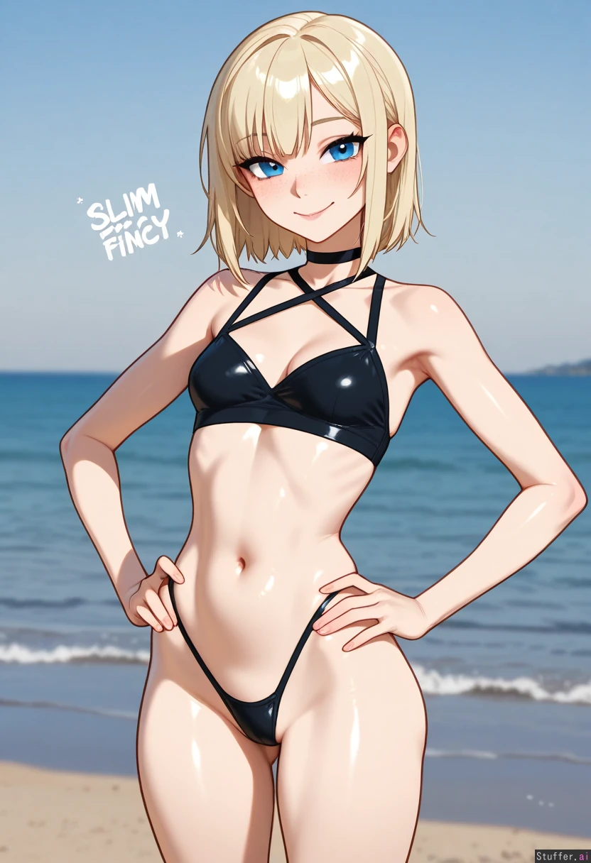 hdr, c.cu, blushyspicy, betterwithsalt:1.4, best quality, anime, beautiful, intricate details, pewbutt(artist), masterpiece, beautiful 8k, high resolution, maximum pixel density, masterpiece, (((highly detailed))), ((flawless)), (((high rating))), ((highly detailed face)), full resolution, 8k, high resolution, best quality, 1woman, milf, detailed eyes, ((solo)) Appearance: Long straight blonde hair, blue eyes, tan skin, freckles, blushing heavily, anime-woman, sly smile, hands on hips Outfit: blue bikin top, black thong Location: at the beach (posing on beach), side-view, looking at viewer Modifiers: (Slim figure:1.8), (chubby belly:1.0), (morbidly obese ssbbw figure:1.0), voluptuous, (weight gain), (Modest breasts:0.75), (breast expansion), (Wide waist:1.0), (thick thighs:1.0), (wide hips:1.0),