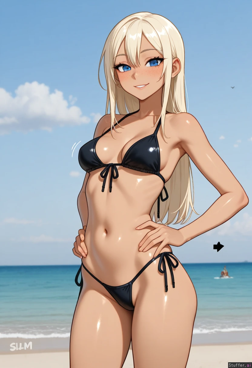 hdr, c.cu, blushyspicy, betterwithsalt:1.4, best quality, anime, beautiful, intricate details, pewbutt(artist), masterpiece, beautiful 8k, high resolution, maximum pixel density, masterpiece, (((highly detailed))), ((flawless)), (((high rating))), ((highly detailed face)), full resolution, 8k, high resolution, best quality, 1woman, milf, detailed eyes, ((solo)) Appearance: Long straight blonde hair, blue eyes, tan skin, freckles, blushing heavily, anime-woman, sly smile, hands on hips Outfit: blue bikin top, black thong Location: at the beach (posing on beach), side-view, looking at viewer Modifiers: (Slim figure:1.8), (chubby belly:1.0), (morbidly obese ssbbw figure:1.0), voluptuous, (weight gain), (Modest breasts:0.75), (breast expansion), (Wide waist:1.0), (thick thighs:1.0), (wide hips:1.0),