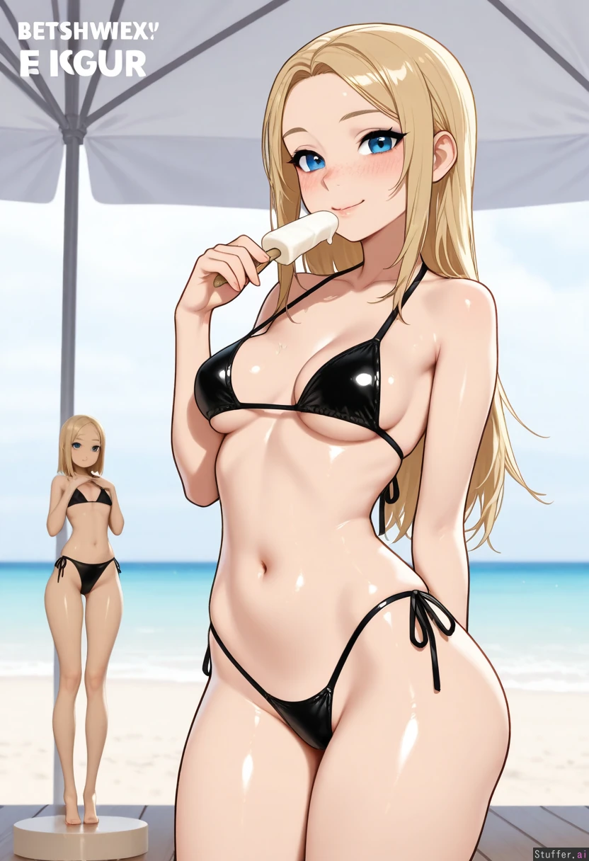 hdr, c.cu, blushyspicy, betterwithsalt:1.4, best quality, anime, beautiful, intricate details, pewbutt(artist), masterpiece, beautiful 8k, high resolution, maximum pixel density, masterpiece, (((highly detailed))), ((flawless)), (((high rating))), ((highly detailed face)), full resolution, 8k, high resolution, best quality, 1woman, milf, detailed eyes, ((solo)) Appearance: Long straight blonde hair, blue eyes, tan skin, freckles, blushing heavily, anime-woman, sly smile, ice cream in hand, eating ice cream Outfit: blue bikin top, black thong Location: at the beach (posing on beach), side-view, looking at viewer Modifiers: (Slim figure:1.78), (chubby belly:1.0), (morbidly obese ssbbw figure:1.0), voluptuous, (weight gain), (Modest breasts:0.77), (breast expansion), (Wide waist:1.0), (thick thighs:1.0), (wide hips:1.0),