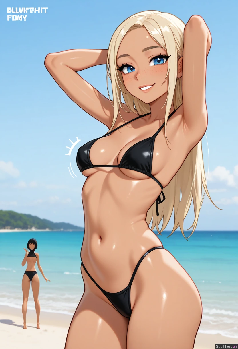 hdr, c.cu, blushyspicy, betterwithsalt:1.4, best quality, anime, beautiful, intricate details, pewbutt(artist), masterpiece, beautiful 8k, high resolution, maximum pixel density, masterpiece, (((highly detailed))), ((flawless)), (((high rating))), ((highly detailed face)), full resolution, 8k, high resolution, best quality, 1woman, milf, detailed eyes, ((solo)) Appearance: Long straight blonde hair, blue eyes, tan skin, freckles, blushing heavily, anime-woman, sly smile, arms raised Outfit: blue bikin top, black thong Location: at the beach (posing on beach), side-view, looking at viewer Modifiers: (Slim figure:1.70), (chubby belly:1.0), (morbidly obese ssbbw figure:1.0), voluptuous, (weight gain), (Modest breasts:0.85), (breast expansion), (Wide waist:1.0), (thick thighs:1.0), (wide hips:1.0),