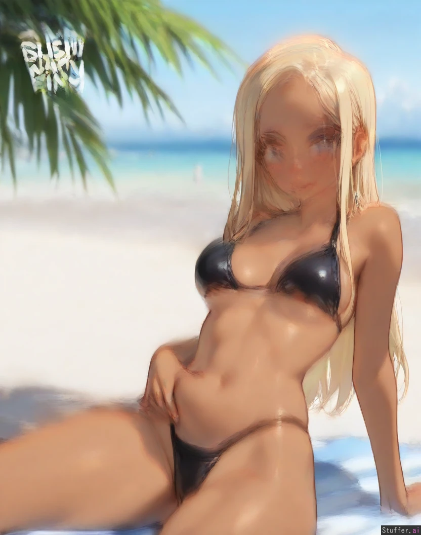hdr, c.cu, blushyspicy, betterwithsalt:1.4, best quality, anime, beautiful, intricate details, pewbutt(artist), masterpiece, beautiful 8k, high resolution, maximum pixel density, masterpiece, (((highly detailed))), ((flawless)), (((high rating))), ((highly detailed face)), full resolution, 8k, high resolution, best quality, 1woman, milf, detailed eyes, ((solo)) Appearance: Long straight blonde hair, blue eyes, tan skin, freckles, blushing heavily, anime-woman, sly smile, sitting, leaning back Outfit: blue bikin top, black thong Location: at the beach (posing on beach), side-view, looking at viewer Modifiers: (Slim figure:1.65), (chubby belly:1.0), (morbidly obese ssbbw figure:1.0), voluptuous, (weight gain), (Modest breasts:0.88), (breast expansion), (Wide waist:1.0), (thick thighs:1.0), (wide hips:1.0),