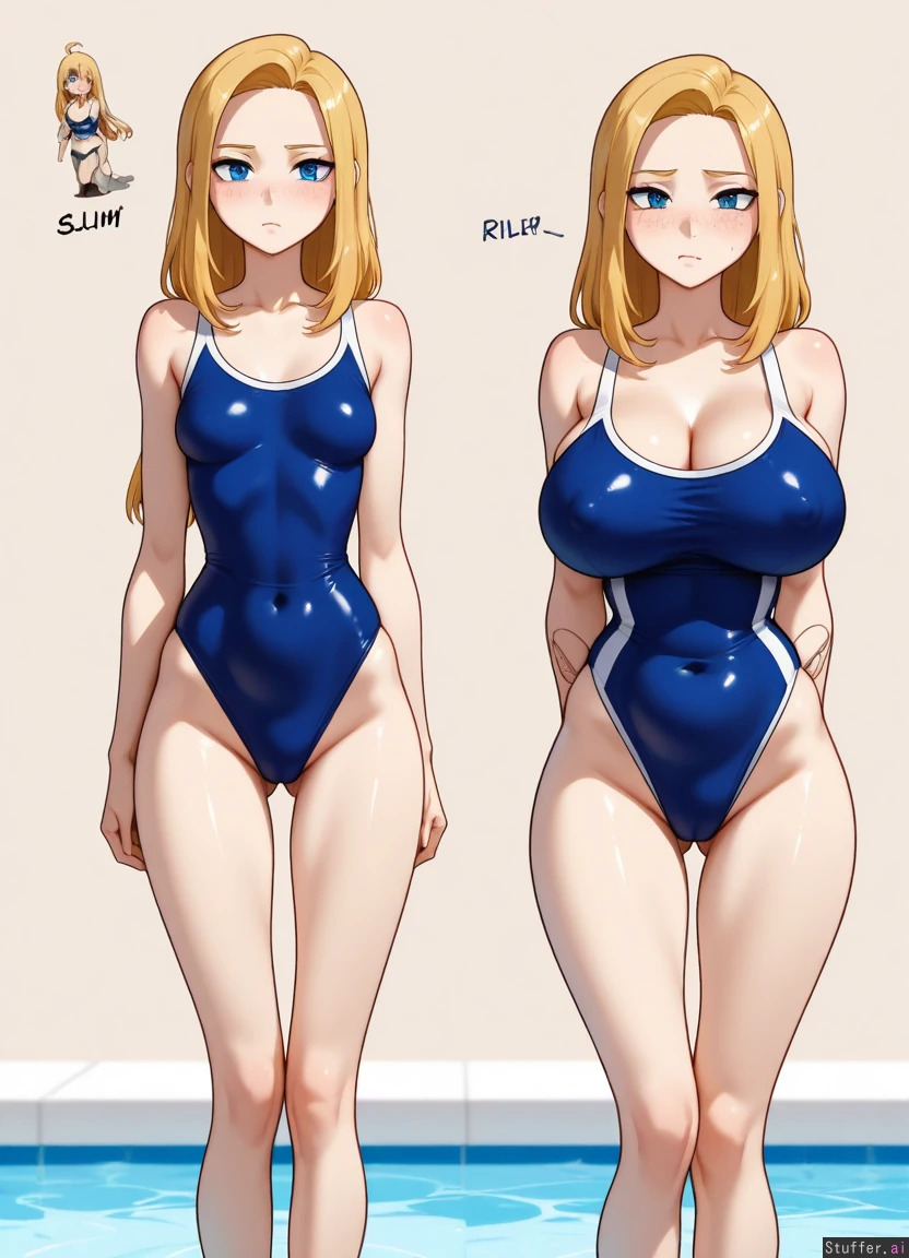 (Kinkymation(artist):0.5), (pudgeruffian(artist):0.3), Beige background, 1woman, milf, solo, (simple style), ((less detail)), ((flat colors)), ((flawless)), (((high rating))), ((highly detailed face)), full resolution, 8k, high resolution, best quality, detailed eyes, Appearance: Long straight blonde hair, blue eyes, pale skin, freckles, blushing, anime-woman, sexy expression, pouting, Outfit: (very tight blue one piece swimsuit) Location: at the pool (posing in pool), side-view, looking at viewer, standing Modifiers: (Slim figure:1.8), (chubby belly:1.0), (morbidly obese ssbbw figure:1.0), voluptuous, (weight gain), chubby (Large breasts:1.0), (breast expansion), top heavy, erect nipples (Wide waist:1.0), (thick thighs:1.0), (wide hips:1.0), fupa