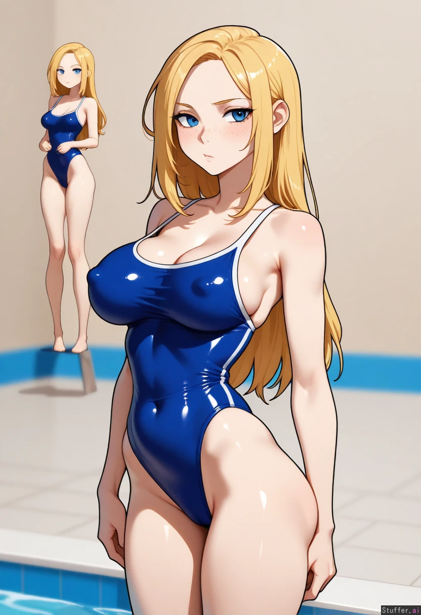 (Kinkymation(artist):0.5), (pudgeruffian(artist):0.3), Beige background, 1woman, milf, solo, (simple style), ((less detail)), ((flat colors)), ((flawless)), (((high rating))), ((highly detailed face)), full resolution, 8k, high resolution, best quality, detailed eyes, Appearance: Long straight blonde hair, blue eyes, pale skin, freckles, blushing, anime-woman, sexy expression, pouting, Outfit: (very tight blue one piece swimsuit) Location: at the pool (posing in pool), side-view, looking at viewer, standing Modifiers: (Slim figure:1.8), (chubby belly:1.0), (morbidly obese ssbbw figure:1.0), voluptuous, (weight gain), chubby (Large breasts:1.0), (breast expansion), top heavy, erect nipples (Wide waist:1.0), (thick thighs:1.0), (wide hips:1.0), fupa