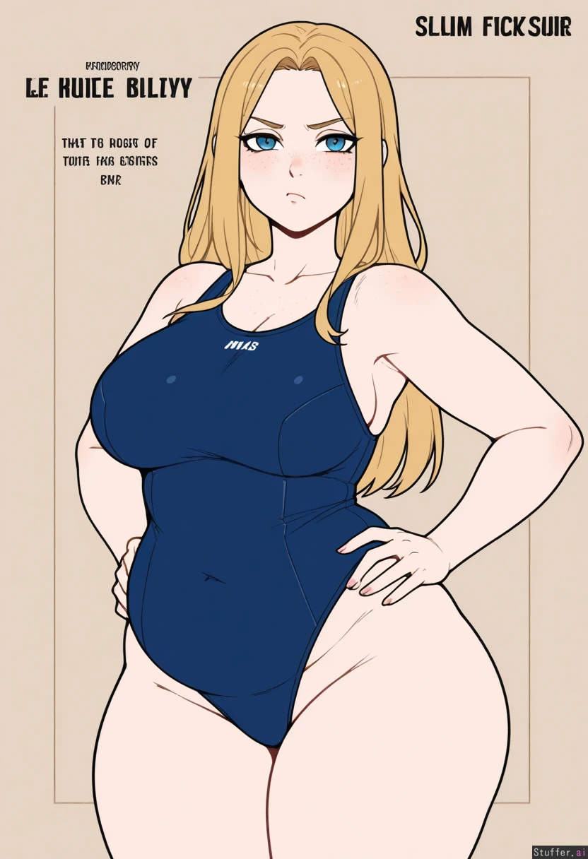 (Kinkymation(artist):0.5), (pudgeruffian(artist):0.3), Beige background, 1woman, milf, solo, (simple style), ((less detail)), ((flat colors)), (((high rating))), ((highly detailed face)), high resolution, best quality, detailed eyes, Appearance: Long straight blonde hair, blue eyes, pale skin, freckles, blushing, anime-woman, sexy expression, pouting, Outfit: (very tight blue one piece swimsuit) Action: looking at viewer, standing, hands on hips, Modifiers: (Slim figure:1.8), (chubby belly:1.0), (morbidly obese ssbbw figure:1.0), (Large breasts:0.75), (Wide waist:1.0), (thick thighs:1.0), (wide hips:1.0),