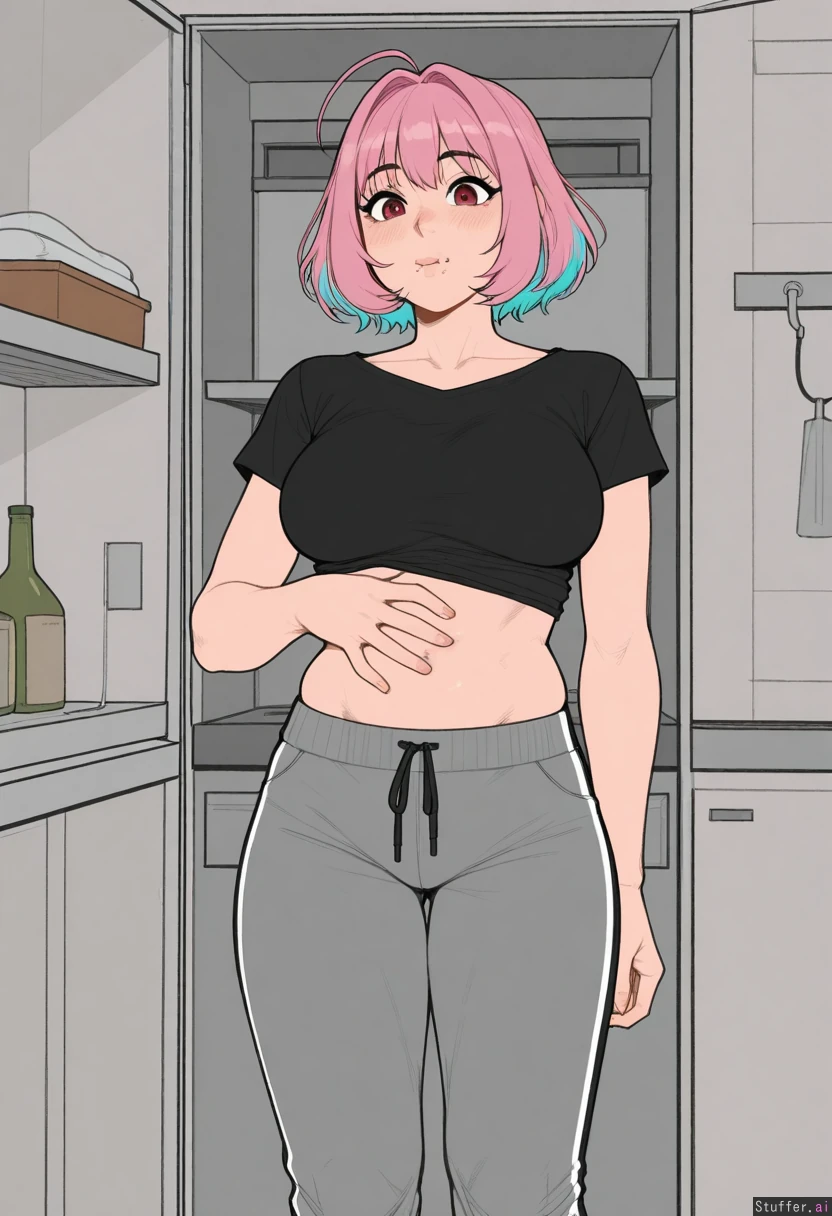 Solo, Krekkov (artist), KAMII MOMORU(artist), (Flat colors), one girl, Riamu_yumemi(idolmaster), realistic proportions, kitchen, standing in front of fridge, surprised, crumbs on mouth, blush, hand on own stomach, holding food, black crop top, ((toned, skinny, flat stomach:0.95)), ((bloated, stuffed_belly, skindentation, undersized_clothes, flabby_stomach, stomach_rolls:0.05)), bored, belly focus, from_front, grey sweatpants