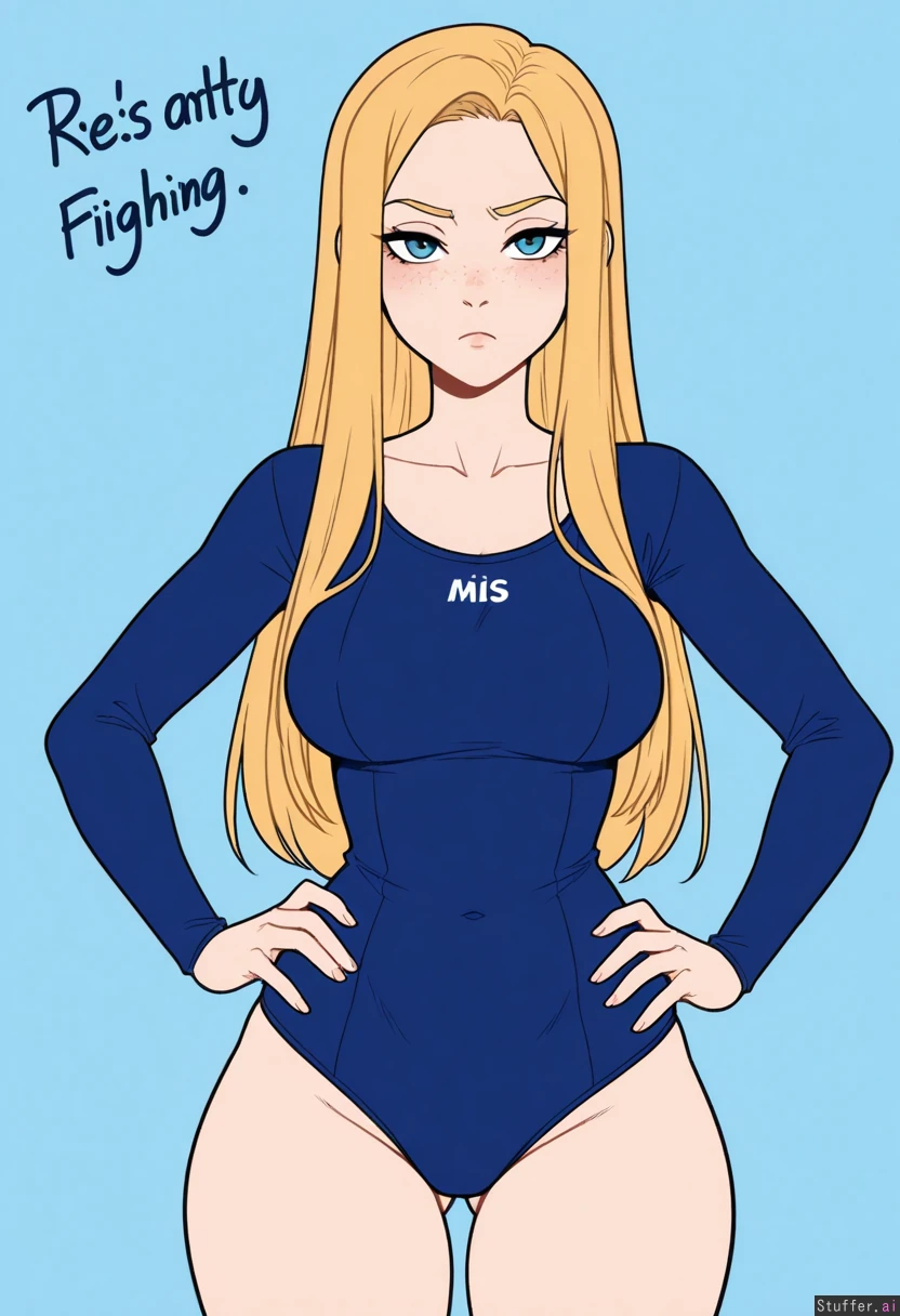 (Kinkymation(artist):0.5), (pudgeruffian(artist):0.3), Light blue background, 1woman, milf, solo, (simple style), ((less detail)), ((flat colors)), (((high rating))), ((highly detailed face)), high resolution, best quality, detailed eyes, Appearance: Long straight blonde hair, blue eyes, pale skin, freckles, blushing, sexy expression, pouting, Outfit: (very tight blue one piece swimsuit) Action: looking at viewer, standing, hands on hips, Modifiers: (Slim figure:1.8), (chubby belly:0.8), (morbidly obese ssbbw figure:0.8), (Large breasts:0.75), (Wide waist:0.8), (thick thighs:0.8), (wide hips:0.8),
