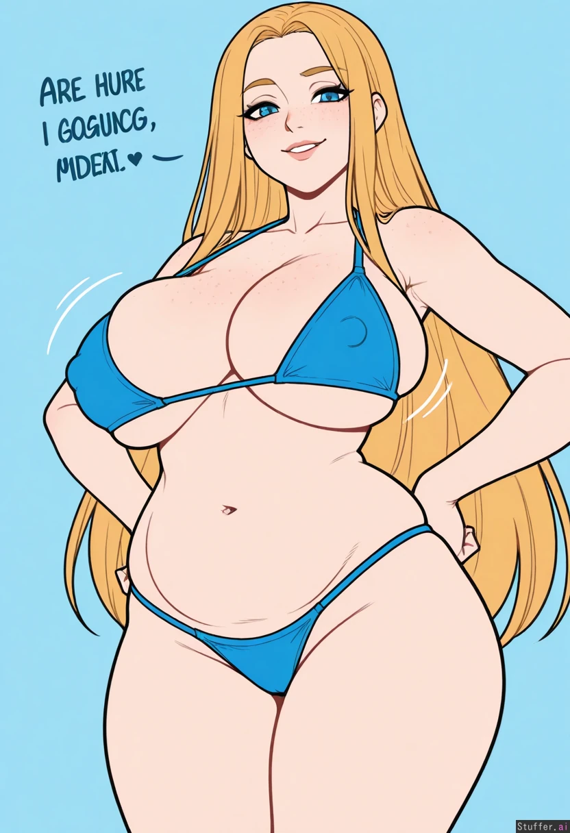 (Kinkymation(artist):0.5), (pudgeruffian(artist):0.3), Light blue background, 1woman, milf, solo, (simple style), ((less detail)), ((flat colors)), (((high rating))), ((highly detailed face)), high resolution, best quality, detailed eyes, Appearance: Long straight blonde hair, blue eyes, pale skin, freckles, blushing, sly smile Outfit: (blue bikini) Action: looking at viewer, standing, hands on hips Modifiers: (Slim figure:1.65), (chubby belly:0.8), (morbidly obese ssbbw figure:0.8), (Large breasts:0.9), ((breast expansion)) erect nipples, (Wide waist:0.8), (thick thighs:0.8), (wide hips:0.8),