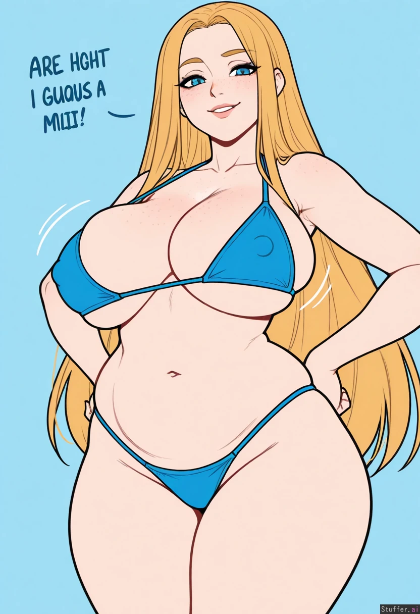 (Kinkymation(artist):0.5), (pudgeruffian(artist):0.3), Light blue background, 1woman, milf, solo, (simple style), ((less detail)), ((flat colors)), (((high rating))), ((highly detailed face)), high resolution, best quality, detailed eyes, Appearance: Long straight blonde hair, blue eyes, pale skin, freckles, blushing, sly smile Outfit: (blue bikini) Action: looking at viewer, standing, hands on hips Modifiers: (Slim figure:1.65), (chubby belly:0.8), (morbidly obese ssbbw figure:0.8), (Large breasts:0.95), ((breast expansion)) erect nipples, top heavy, (Wide waist:1.0), (thick thighs:0.8), (wide hips:1.0),