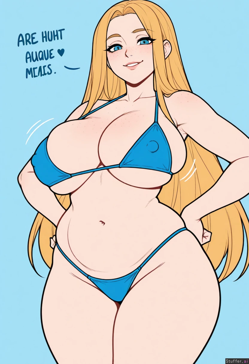 (Kinkymation(artist):0.5), (pudgeruffian(artist):0.3), Light blue background, 1woman, milf, solo, (simple style), ((less detail)), ((flat colors)), (((high rating))), ((highly detailed face)), high resolution, best quality, detailed eyes, Appearance: Long straight blonde hair, blue eyes, pale skin, freckles, blushing, sly smile Outfit: (blue bikini) Action: looking at viewer, standing, hands on hips Modifiers: (Slim figure:1.65), (chubby belly:0.8), (morbidly obese ssbbw figure:0.8), (Large breasts:1.0), ((breast expansion)) (erect nipples), top heavy, bursting breasts (Wide waist:1.0), (thick thighs:0.8), (wide hips:1.0),