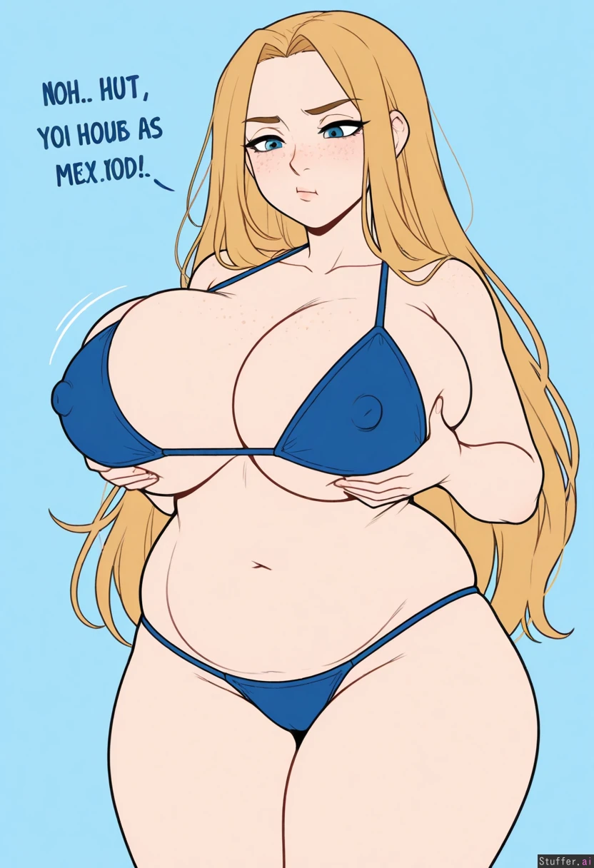 (Kinkymation(artist):0.5), (pudgeruffian(artist):0.3), Light blue background, 1woman, milf, solo, (simple style), ((less detail)), ((flat colors)), (((high rating))), ((highly detailed face)), high resolution, best quality, detailed eyes, Appearance: Long straight blonde hair, blue eyes, pale skin, freckles, blushing, pouting, Outfit: (outgrown blue bikini) Action: looking at self, standing, hands grabbing breasts Modifiers: (Slim figure:1.55), (chubby belly:0.8), (morbidly obese ssbbw figure:0.8), (Huge breasts:0.9), ((breast expansion)) (erect nipples), top heavy, bursting breasts (Wide waist:1.0), (thick thighs:0.8), (wide hips:1.0),