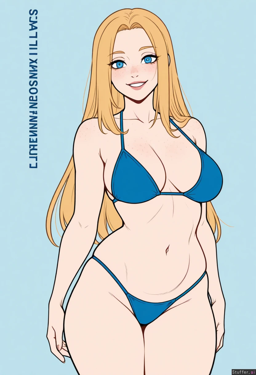 (Kinkymation(artist):0.5), (pudgeruffian(artist):0.3), Light blue background, 1woman, milf, solo, (simple style), ((less detail)), ((flat colors)), (((high rating))), ((highly detailed face)), high resolution, best quality, detailed eyes, Appearance: Long straight blonde hair, blue eyes, pale skin, freckles, blushing, smiling, orgasm, crazy eyes Outfit: (blue bikini) Action: looking at viewer, standing, Modifiers: (Slim figure:1.80), (Big fat round belly:0.77), (morbidly obese ssbbw figure:0.77), (Large breasts:0.85), (Wide waist:1.0), (thick thighs:1.0), (wide hips:1.0),