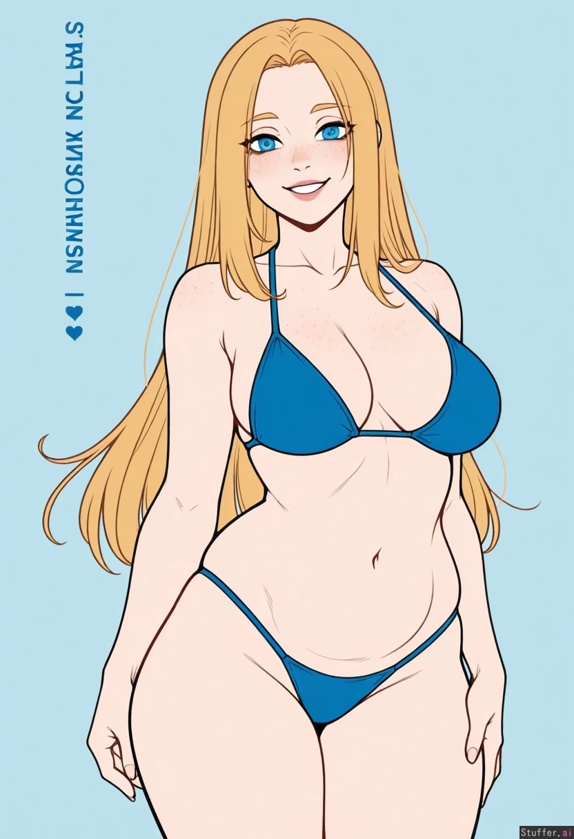 (Kinkymation(artist):0.5), (pudgeruffian(artist):0.3), Light blue background, 1woman, milf, solo, (simple style), ((less detail)), ((flat colors)), (((high rating))), ((highly detailed face)), high resolution, best quality, detailed eyes, Appearance: Long straight blonde hair, blue eyes, pale skin, freckles, blushing, smiling, orgasm, crazy eyes Outfit: (blue bikini) Action: looking at viewer, standing, Modifiers: (Slim figure:1.76), (Big fat round belly:0.79), (morbidly obese ssbbw figure:0.79), (Large breasts:0.87), (Wide waist:1.0), (thick thighs:1.0), (wide hips:1.0),
