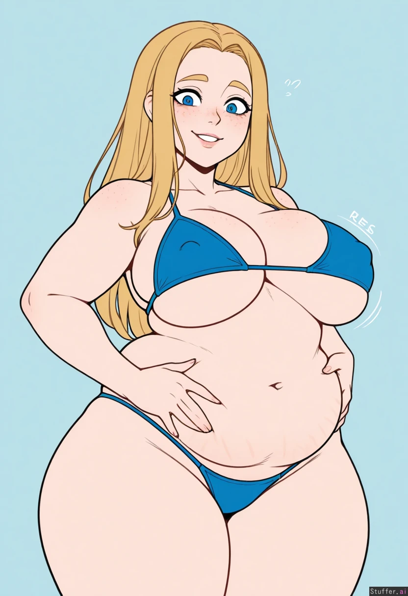 (Kinkymation(artist):0.5), (pudgeruffian(artist):0.3), Light blue background, 1woman, milf, solo, (simple style), ((less detail)), ((flat colors)), (((high rating))), ((highly detailed face)), high resolution, best quality, detailed eyes, Appearance: Long straight blonde hair, blue eyes, pale skin, freckles, blushing, smiling, orgasm, crazy eyes Outfit: (blue bikini) Action: looking at viewer, standing, Modifiers: (Slim figure:1.40), (Big fat round belly:0.96), (morbidly obese ssbbw figure:0.96), voluptuous, stretch marks on belly, (Large breasts:1.0), (breast expansion), underboob, erect nipples, (Wide waist:1.0), (thick thighs:1.0), (wide hips:1.0), (plump face:1.0), (fat arms:1.0)