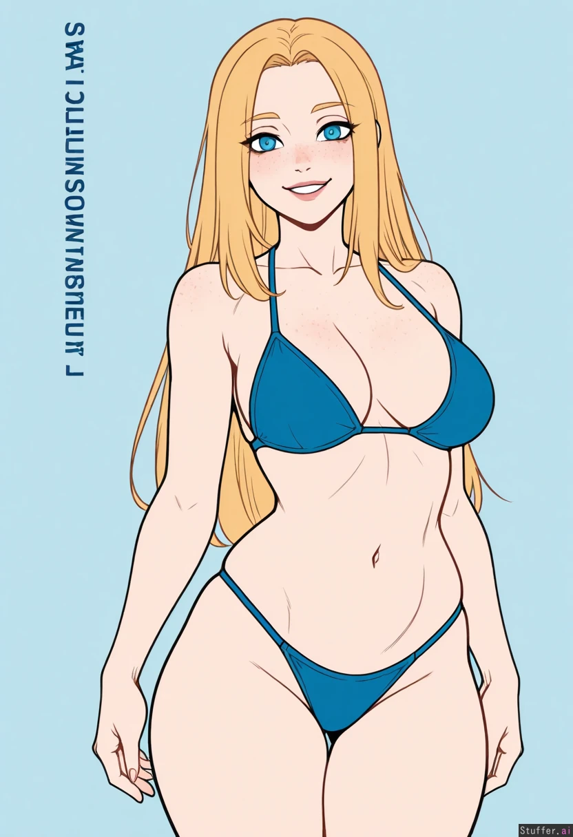 (Kinkymation(artist):0.5), (pudgeruffian(artist):0.3), Light blue background, 1woman, milf, solo, (simple style), ((less detail)), ((flat colors)), (((high rating))), ((highly detailed face)), high resolution, best quality, detailed eyes, Appearance: Long straight blonde hair, blue eyes, pale skin, freckles, blushing, smiling, orgasm, crazy eyes Outfit: (blue bikini) Action: looking at viewer, standing, Modifiers: (Slim figure:1.85), (Big fat round belly:0.75), (morbidly obese ssbbw figure:0.75), (Large breasts:0.8), (Wide waist:1.0), (thick thighs:1.0), (wide hips:1.0),