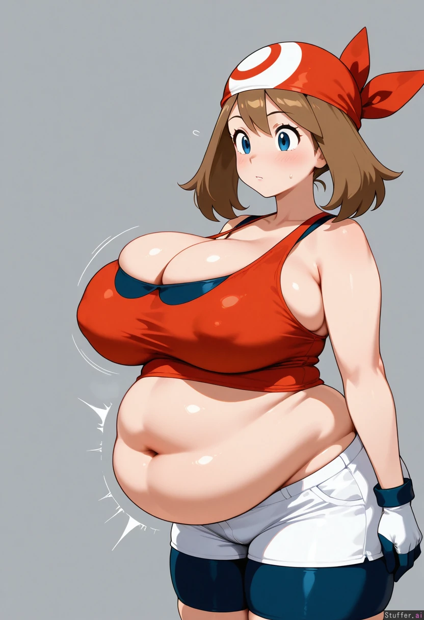 (may_pokemon), adult, solo1, weight gain, fat, big_breasts, big_ass, big_hips, big_belly, breast_expansion, breast_press, breasts_on_belly