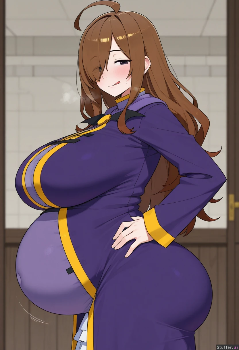 uhd, high resolution, flawless, best_quality, (hdr), (lineless:1.4), perfect anatomy, beautiful face, beautiful eyes, Tweedabop(artist), (ohasi_art), (betterwithsalt), w-oo-t(artist),(perfect hands). Solo. (eyes half open), (licking lips), ( hands on hips),(heavy breathing),(horny expression), naughty face, ((hyper belly:1.0)), (big ass), side view, ((wiz, konosuba)), Big breasts.