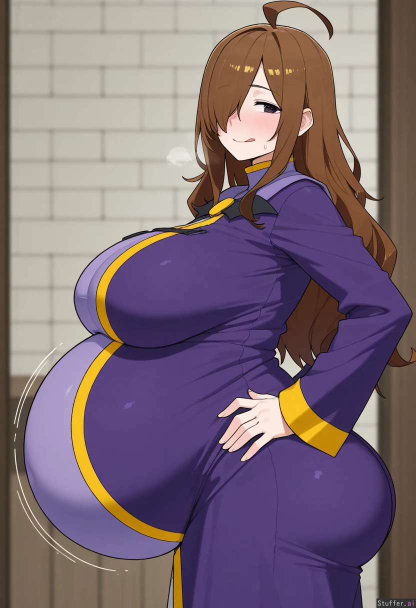 uhd, high resolution, flawless, best_quality, (hdr), (lineless:1.4), perfect anatomy, beautiful face, beautiful eyes, Tweedabop(artist), (ohasi_art), (betterwithsalt), w-oo-t(artist),(perfect hands). Solo. (eyes half open), (licking lips), ( hands on hips),(heavy breathing),(horny expression), naughty face, ((hyper belly:1.3)), (big ass), side view, ((wiz, konosuba)), Big breasts.