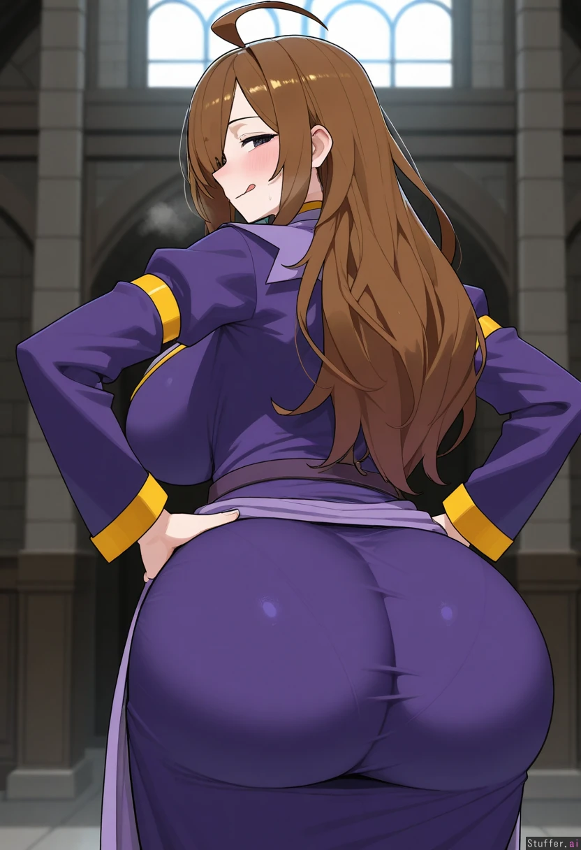 uhd, high resolution, flawless, best_quality, (hdr), (lineless:1.4), perfect anatomy, beautiful face, beautiful eyes, Tweedabop(artist), (ohasi_art), (betterwithsalt), w-oo-t(artist),(perfect hands). Solo. (eyes half open), (licking lips), ( hands on hips),(heavy breathing),(horny expression), naughty face, ((hyper ass:1.4)), (big ass), back view, ((wiz, konosuba)), Big breasts.
