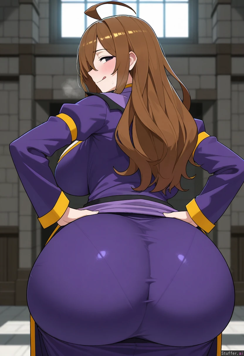 uhd, high resolution, flawless, best_quality, (hdr), (lineless:1.4), perfect anatomy, beautiful face, beautiful eyes, Tweedabop(artist), (ohasi_art), (betterwithsalt), w-oo-t(artist),(perfect hands). Solo. (eyes half open), (licking lips), ( hands on hips),(heavy breathing),(horny expression), naughty face, ((hyper ass:1.6)), (big ass), back view, ((wiz, konosuba)), Big breasts.