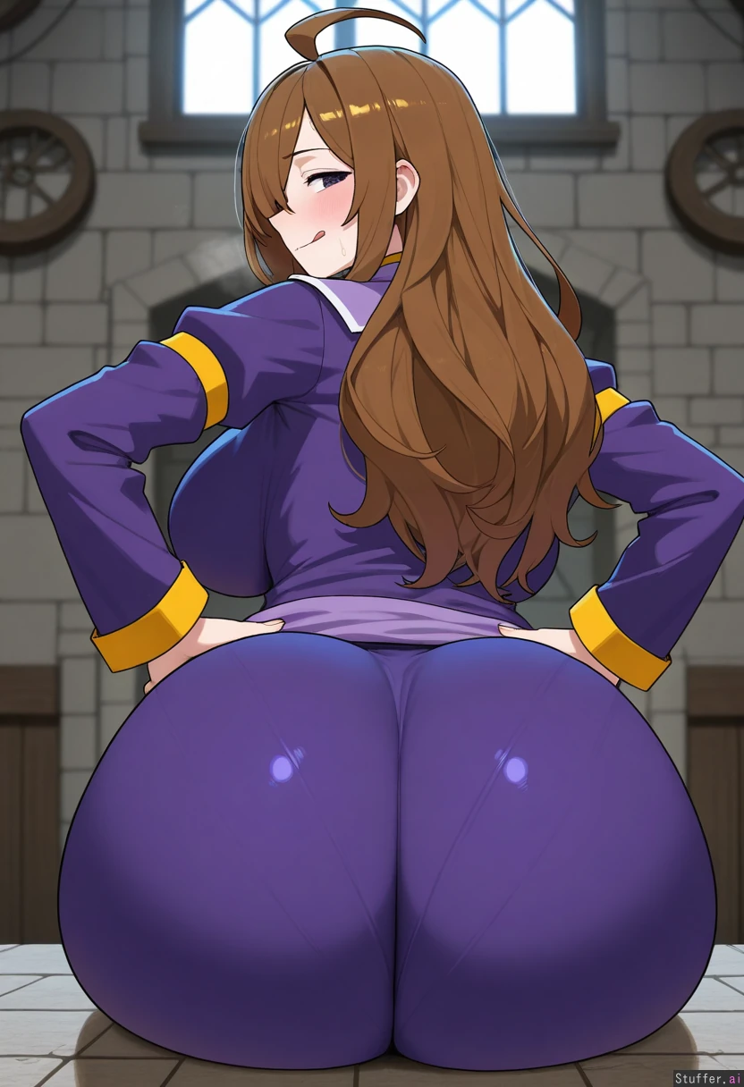 uhd, high resolution, flawless, best_quality, (hdr), (lineless:1.4), perfect anatomy, beautiful face, beautiful eyes, Tweedabop(artist), (ohasi_art), (betterwithsalt), w-oo-t(artist),(perfect hands). Solo. (eyes half open), (licking lips), ( hands on hips),(heavy breathing),(horny expression), naughty face, ((hyper ass:1.8)), (big ass), back view, ((wiz, konosuba)), Big breasts.
