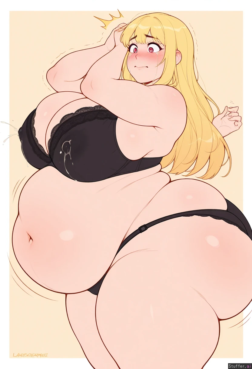 (((flat color):1, shading, (kittew(artist):0.5), (blushyspicy(artist):0.3), matte), motion lines, (skindentation) (solo) (chubby girl), (curvy figure), (beautiful face), (pink eyes), (blonde long side part), (tight lace black panties and bra), (bulging nipples under bra), (cameltoe), ((sideboob overflow)), ((surprised)), ((flustered)), ((sobbing)), (((crying))), (fat huge thick thighs:1.5), (chubby soft belly:1.5, deep_navel), (chubby breasts:0.95), (bottom heavy), (gigantic fat ass:1.85), (chubby body:1.45), (chubby face:1.2), ((fat long belly drooping:1.75)), (((belly hang:1.5))), (((boobs are bulging over bra))), (((bra is way to small))), (((extra wide fat hips:1.2))), (((extra wide ass:1.5))), (((bubblebutt:1))), (shy), (blushing), (side view), looking down at belly, grabbing her boobs, ((((bra burst and broken)))), correct anatomy, ((lactating:1.5)), (((Chubby arms:1.4))), ((plain background)), ((empty background)), ((single color background))