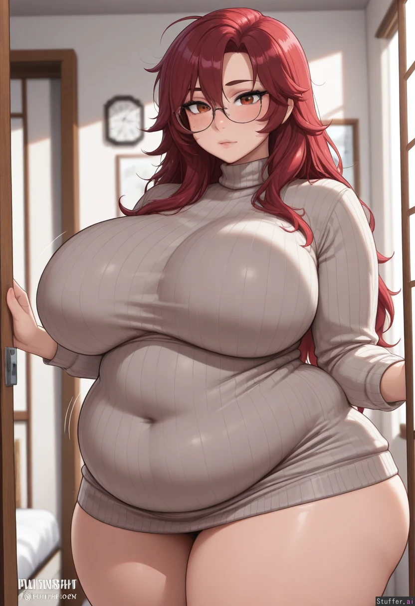 (((Hyperfusion_style:1.8, soft lighting, realistic lighting, volumetric lighting, hyper precision-detailed:1.4))), (((masterpiece, best quality, 8K resolution, focus on details, best quality possible, sharp image, gorgeus, beautiful, highres, vibrant colors, crisp lines, extremely detailed face))), soft lighting, 1girl, solo, (detailed skin, realistic skin texture, freckles), messy hair, dark red hair, messy hair, amber eyes, Kittew(artist), sciamano240(artist), (((extremely curvy, absurdly voluptuous, plump, thick body))), (Huge breasts, (pendulous breasts, super full breasts)), (obese pelvis), (defined waist), (fat rolls), (Extra massive hips, broad hips, bottom heavy), (extremely thick thighs, extremely fat legs), (fat arms), Tight dark sweater dress, bedroom, morning, ((huge hips), ((fat butt, huge butt))), (((chubby))), ((plump-chubby belly, overweight, thick bbw:1.3)), (((Huge-bloated super-full hyper-belly:1.3))), ((Ultra HD), (perfect lighting), realism), HDR, best quality, masterpiece, hyper detail, (wide view:1.4, one view, single scene), Absurdres, 8k, perfect anatomy, masterpiece, beautiful face, beautiful eyes, RockSolidArt. /(artist/), RockSolidArt(artist/) ,8), (merunyaa), (usa37107692:1.2), (ohasi_art), (betterwithsalt), (flat color:1.5) c.cu(artist), kittew(artist), prywinko(artist), spellsx(artist), ohshinakai(artist), doveymouse(artist), Ninjart1st(artist), c.cu\(artist\):1.3), (blushyspicy\(artist\):1.2), (kipteitei\(artist\):1.2), (spellsX\(artist\):1.3), (Kittew\(artist\):1.3), (ohshinakai\(artist\):1.2), (doveymouse\(artist\):1.3), (Ninjart1st\(artist\):1.2), (Jellybelly\(artist\):1.3), (troat301186\(artist\):1.2), (toraraz\(artist\):1.3), ((highest resolution and clarity)), (perfect human anatomy), (high image clarity, sharp image focus), (4k_UHD, highly detailed, highest rating, high resolution, masterpiece quality, realistic expressions, intricate texture detail, dynamic lighting), detailed face, best quality, masterpiece, (plump:1.5), (thick), (fat:1.2), massive belly, sexy chubby belly, hdr, c.cu:1.2, blushyspicy:1.4, prywinko:1.4, betterwithsalt:1.2, icarusillustrations:1.4, Icarusillustrations:1.2, kittew:1.2, (spellsX\(artist\):1.3), (Coffeeslice\(artist\):1.3), (ohshinakai\(artist\):1.2), (doveymouse\(artist\):1.3), (((Super-lewd body:1.4))), (flat colors). ((white cutline-outline):1.3). masterful comic-book shading. masterpiece drawing. well-drawn lines. simple detailed eyes. pupils. gorgeous hair. beautiful woman. kipteitei. pewbutt. betterwithsalt.
