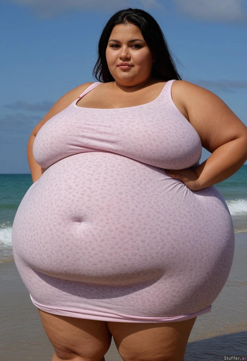 ((((Large breasted chubby Latina girl on the beach, ((enormous soft blob belly, huge soft love handles, )) huge soft hips thighs,