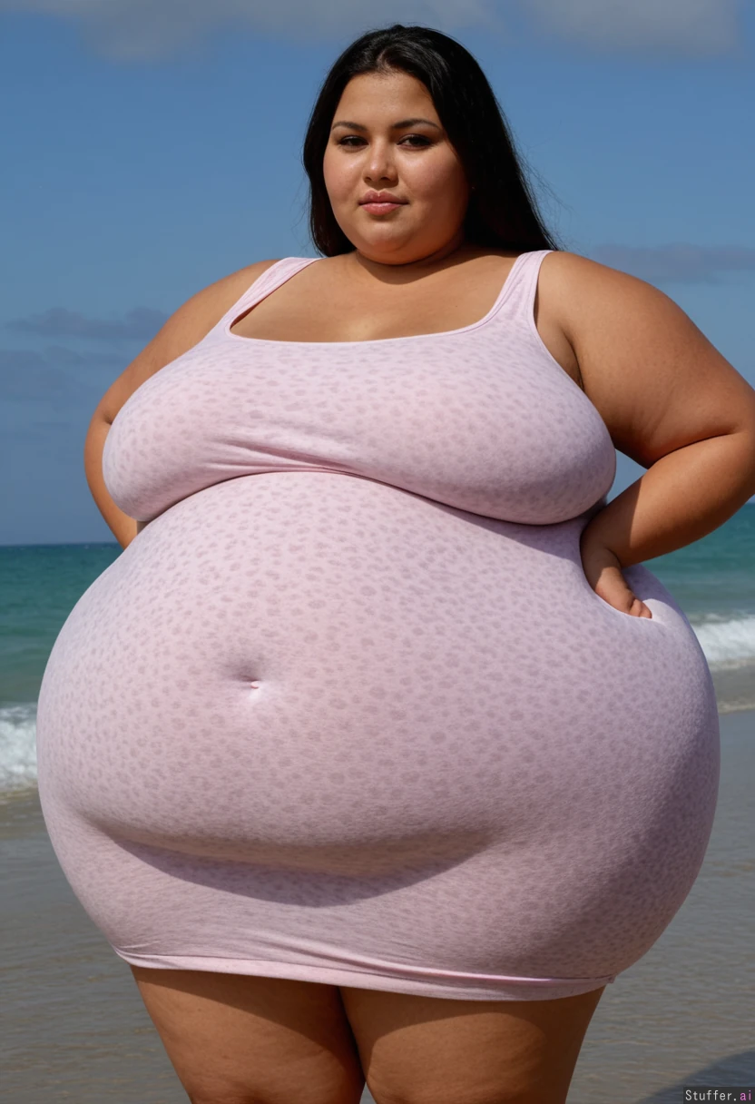 ((((Large breasted chubby Latina girl on the beach, ((enormous soft blob belly, huge soft love handles, )) huge soft hips thighs,