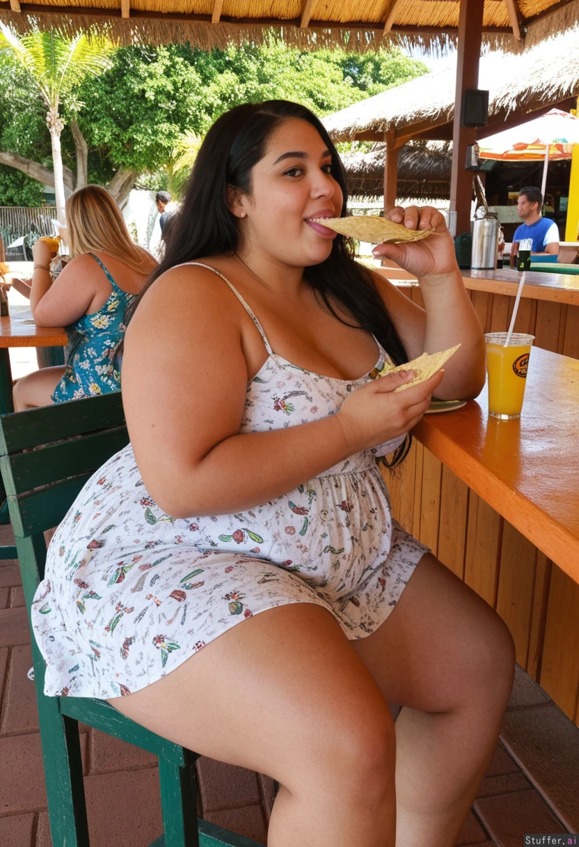 Large breasted chubby dark skin Latina, extra long hair , slight smile, enjoying her food and drinking, Plump, chubby, fat, big thick, very soft, very fat, huge soft fat thighs, wide huge soft hips, huge wide soft fat bum, (( short sundress, )) ((Sitting at an outdoor tropical taco bar, eating a taco and drinking a corona beer)) , side view