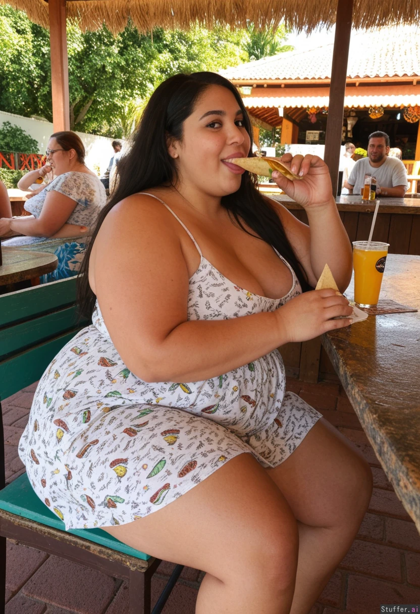 Large breasted chubby dark skin Latina, extra long hair , slight smile, enjoying her food and drinking, Plump, chubby, fat, big thick, very soft, very fat, huge soft fat thighs, wide huge soft hips, huge wide soft fat bum, (( short sundress, )) ((Sitting at an outdoor tropical taco bar, eating a taco and drinking a corona beer)) , (side view)