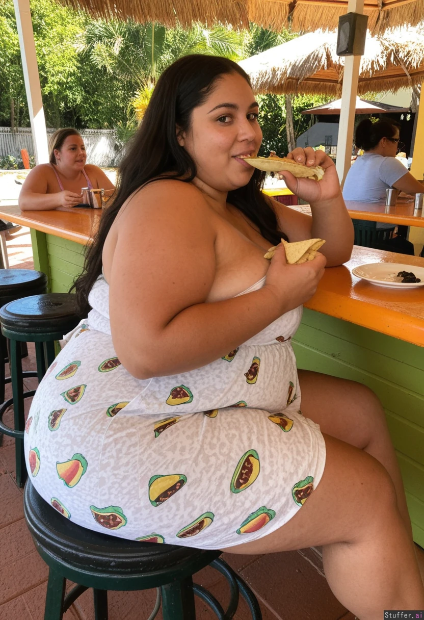 Large breasted chubby dark skin Latina, extra long hair , slight smile, enjoying her food and drinking, (Plump, chubby, fat, big thick, very soft, very fat, huge soft fat thighs, wide huge soft hips, huge wide soft fat bum, big low soft belly, ) (( short sundress, )) ((Sitting at an outdoor tropical taco bar, eating a taco and drinking a corona beer)) , (((side view)))