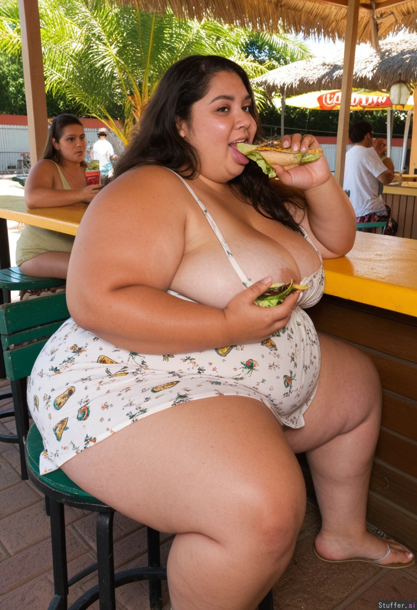 Large breasted chubby dark skin Latina, extra long hair , slight smile, enjoying her food and drinking, ((Plump, chubby, fat, big thick, very soft, very fat, huge soft fat thighs, wide huge soft hips, huge wide soft fat bum, enormous blob low soft belly, )) (( short sundress, )) ((Sitting at an outdoor tropical taco bar, eating a taco and drinking a corona beer)) , ((side view))