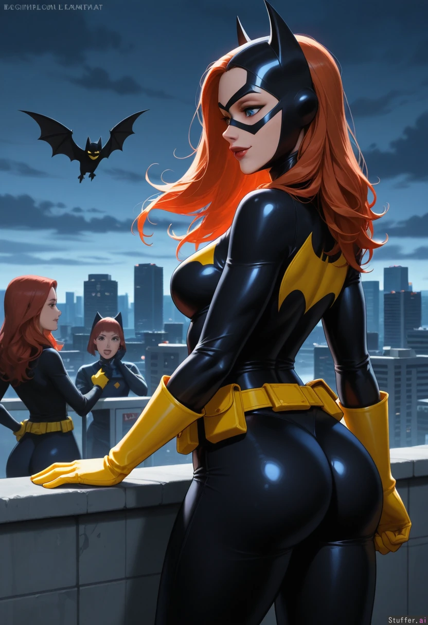 1girl, female, dc_comics, dc, batman_(series), no_cape, 1girl, batgirl_(barbara_Gordon), (Barbara Gordon), batgirl, batgirl_(dc), girl with blue eyes and red lipstick and red hair with bangs, female, blue_eyes, red_lipstick, long_hair, red_hair, bangs, redhead, mature_female, babe, hot body, pretty face, utility_belt, clothed_female, big_ass/butt/booty, standing, slight_smile, passionate, pleasure, hands_on_waists, front_side, front_view, side_profile, side_view, rooftop, gotham, city, night_time, cloudy, determined