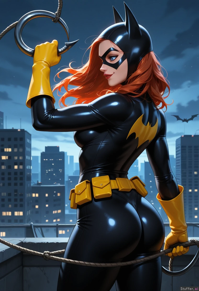 1girl, female, dc_comics, dc, batman_(series), no_cape, 1girl, batgirl_(barbara_Gordon), (Barbara Gordon), batgirl, batgirl_(dc), girl with blue eyes and red lipstick and red hair with bangs, female, blue_eyes, red_lipstick, long_hair, red_hair, bangs, redhead, mature_female, babe, hot body, pretty face, utility_belt, clothed_female, big_ass/butt/booty, standing, slight_smile, passionate, pleasure, hands_on_waists, front_side, front_view, side_profile, side_view, rooftop, gotham, city, night_time, cloudy, determined, alone, solo, grappling_hook, swinging, broken_rope