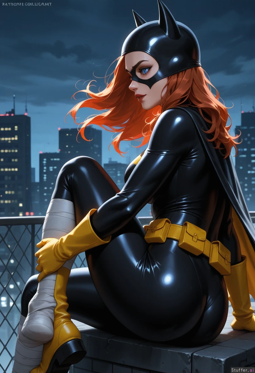 1girl, female, dc_comics, dc, batman_(series), no_cape, 1girl, batgirl_(barbara_Gordon), (Barbara Gordon), batgirl, batgirl_(dc), girl with blue eyes and red lipstick and red hair with bangs, female, blue_eyes, red_lipstick, long_hair, red_hair, bangs, redhead, mature_female, babe, hot body, pretty face, utility_belt, clothed_female, big_ass/butt/booty, hands_on_leg, front_side, front_view, side_profile, side_view, gotham, rooftop, city, night_time, cloudy, scared, pain, fear, afraid, alone, solo, injured_leg, bandaged_leg