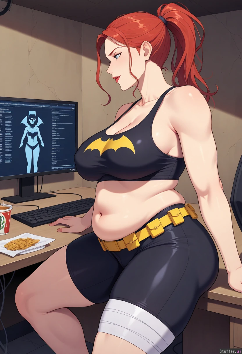 1girl, female, dc_comics, dc, batman_(series), no_cape, no_gloves, 1girl, tank_top, batgirl_(barbara_Gordon), (Barbara Gordon), batgirl, batgirl_(dc), no_mask, girl with blue eyes and red lipstick and red hair ponytail with bangs, female, blue_eyes, red_lipstick, long_hair, red_hair, bangs, redhead, mature_female, babe, hot body, pretty face, utility_belt, clothed_female, big_ass/butt/booty, front_side, front_view, side_profile, gotham, cave, headquarters, batcave, large_computer, food_scraps, alone, solo, injured_leg, injury, bandaged_leg, leg_cast, bandages, wall_calender, pained_look, determined, sitting_at_desk, empty_plate, food_wrapper, candy_wrapper, fast_food, thick_thighs, soft_arms, small_muffin_top ((leg_thickness:0.9)) ((hip_width:1.2)) ((butt_size:0.8)) ((boob_size:0.75)) ((chubby_belly:1))