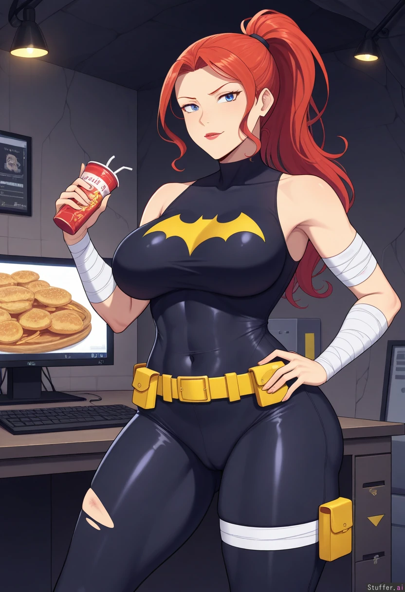1girl, female, dc_comics, dc, batman_(series), no_cape, no_gloves, 1girl, tank_top, batgirl_(barbara_Gordon), (Barbara Gordon), batgirl, batgirl_(dc), no_mask, girl with blue eyes and red lipstick and red hair ponytail with bangs, female, blue_eyes, red_lipstick, long_hair, red_hair, bangs, redhead, mature_female, babe, hot body, pretty face, clothed_female, big_ass/butt/booty, front_side, front_view, gotham, cave, headquarters, batcave, large_computer, food_scraps, alone, solo, injured_leg, injury, bandaged_leg, leg_cast, bandages, wall_calender, pained_look, determined, empty_plate, food_wrapper, candy_wrapper, fast_food, thick_thighs, soft_arms, small_muffin_top, uterine_pouch, holding_drink, cameltoe ((leg_thickness:0.9)) ((hip_width:1.2)) ((butt_size:0.8)) ((boob_size:0.75)) ((chubby_belly:0.85))