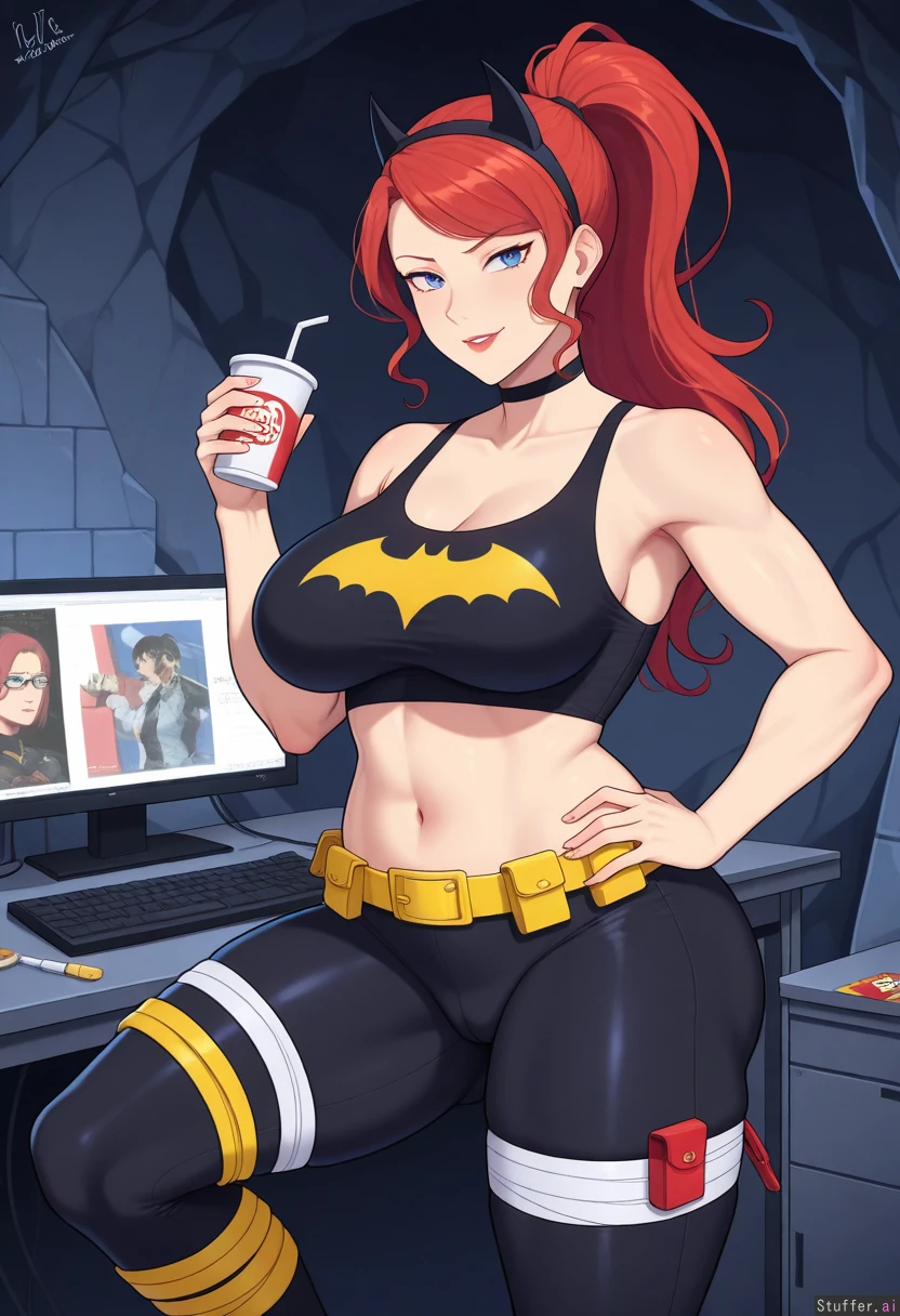 1girl, female, dc_comics, dc, batman_(series), no_cape, no_gloves, 1girl, tank_top, no_utility_belt, batgirl_(barbara_Gordon), (Barbara Gordon), batgirl, batgirl_(dc), no_mask, girl with blue eyes and red lipstick and red hair ponytail with bangs, female, blue_eyes, red_lipstick, long_hair, red_hair, bangs, redhead, mature_female, babe, hot body, pretty face, clothed_female, big_ass/butt/booty, front_side, front_view, gotham, cave, headquarters, batcave, large_computer, food_scraps, alone, solo, injured_leg, injury, bandaged_leg, leg_cast, bandages, wall_calender, pained_look, determined, empty_plate, food_wrapper, candy_wrapper, fast_food, thick_thighs, soft_arms, muffin_top, uterine_pouch, holding_drink, cameltoe, exposed_midriff, ((leg_thickness:0.9)) ((hip_width:1.2)) ((butt_size:0.8)) ((boob_size:0.7)) ((chubby_belly:0.9))