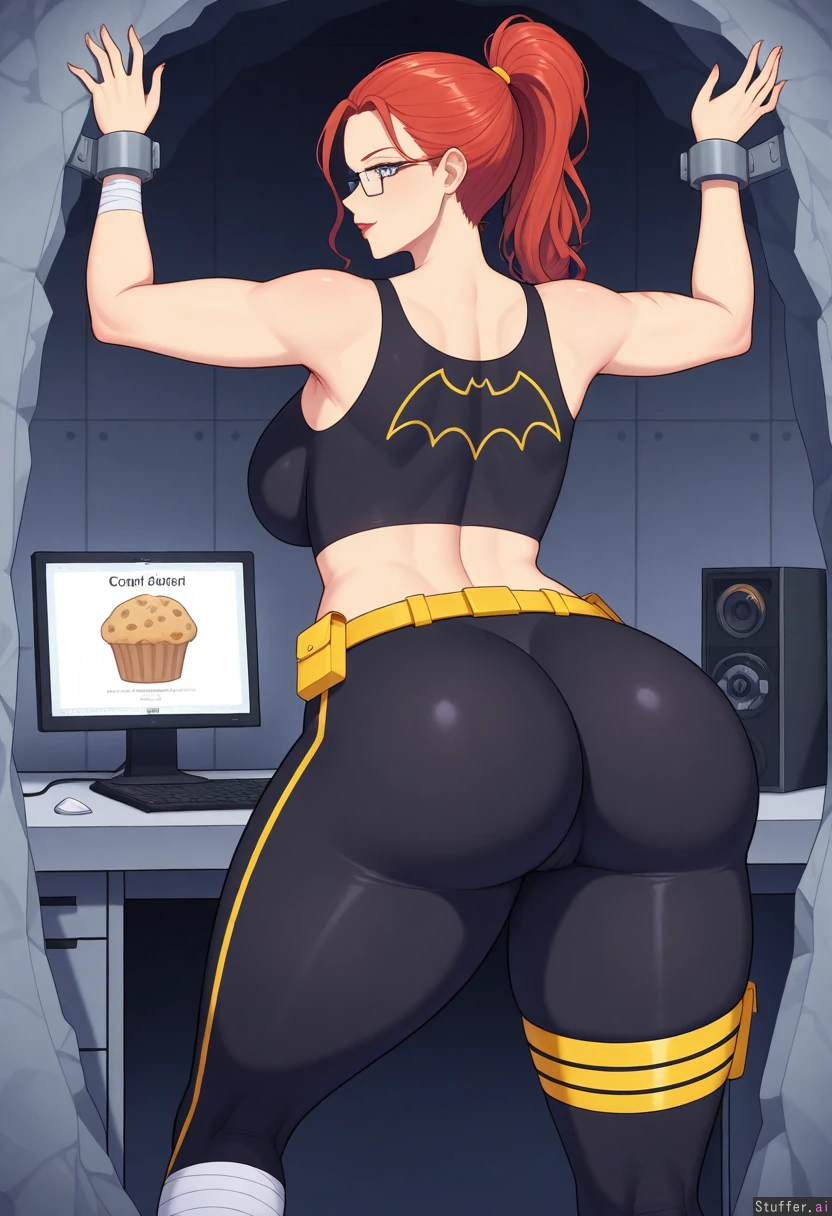 1girl, female, dc_comics, dc, batman_(series), no_cape, no_gloves, 1girl, tank_top, no_utility_belt, batgirl_(barbara_Gordon), (Barbara Gordon), batgirl, batgirl_(dc), no_mask, girl with blue eyes and red lipstick and red hair ponytail with bangs, female, blue_eyes, red_lipstick, long_hair, red_hair, bangs, redhead, mature_female, babe, hot body, pretty face, clothed_female, big_ass/butt/booty, front_side, front_view, gotham, cave, headquarters, batcave, large_computer, food_scraps, alone, solo, injured_leg, injury, bandaged_leg, leg_cast, bandages, wall_calender, pained_look, determined, empty_plate, food_wrapper, candy_wrapper, fast_food, thick_thighs, soft_arms, muffin_top, uterine_pouch, cameltoe, exposed_midriff, yoga_pants, glasses ((leg_thickness:0.9)) ((hip_width:1.2)) ((butt_size:0.9)) ((boob_size:0.65)) ((chubby_belly:1))