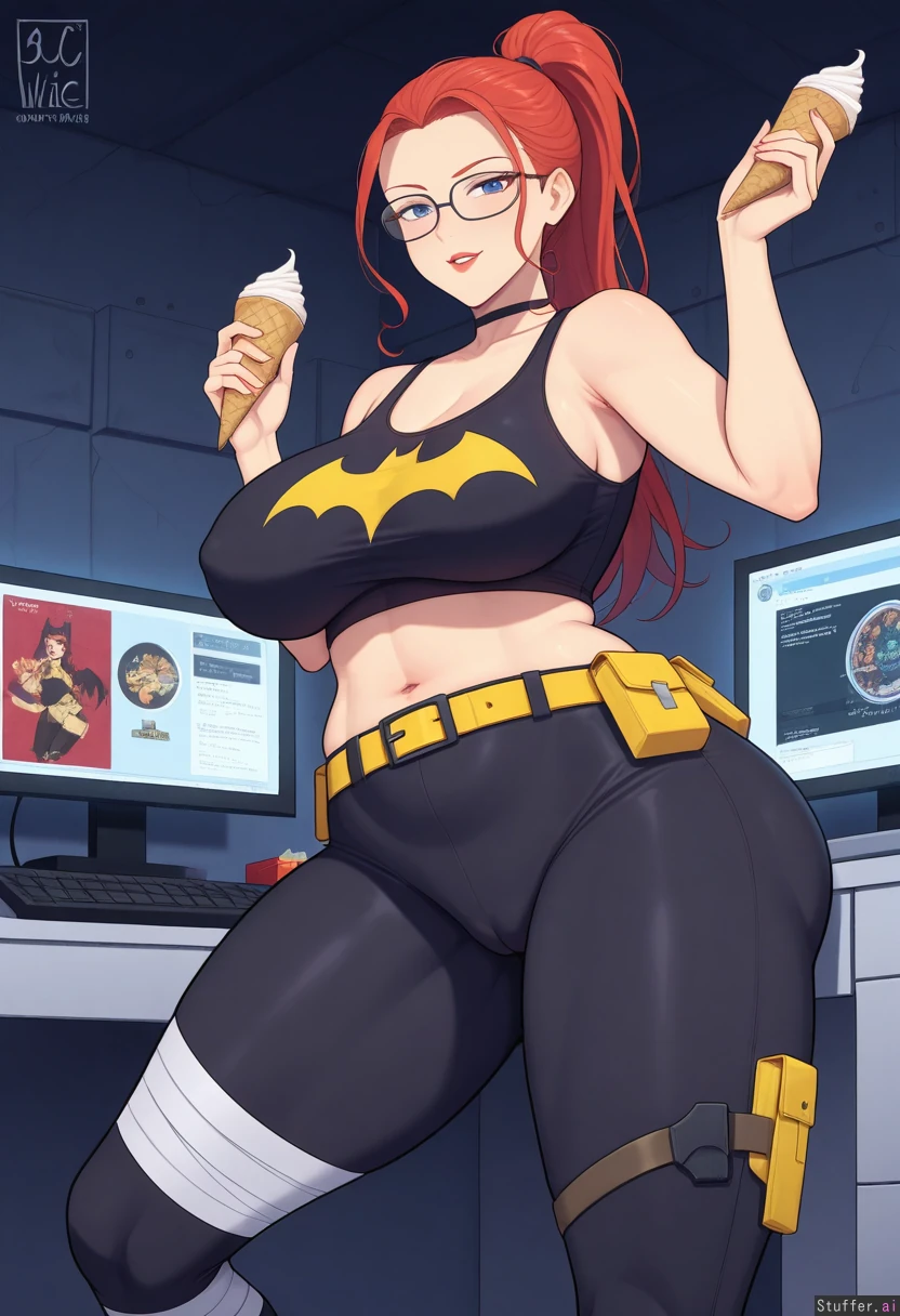 1girl, female, dc_comics, dc, batman_(series), no_cape, no_gloves, 1girl, tank_top, no_utility_belt, batgirl_(barbara_Gordon), (Barbara Gordon), batgirl, batgirl_(dc), no_mask, girl with blue eyes and red lipstick and red hair ponytail with bangs, female, blue_eyes, red_lipstick, long_hair, red_hair, bangs, redhead, mature_female, babe, hot body, pretty face, clothed_female, big_ass/butt/booty, front_side, front_view, forward_facing, gotham, cave, headquarters, batcave, large_computer, food_scraps, alone, solo, injured_leg, injury, bandaged_leg, leg_cast, wall_calender, blissful, empty_plate, food_wrapper, candy_wrapper, fast_food, thick_thighs, soft_arms, muffin_top, uterine_pouch, cameltoe, exposed_midriff, tight_yoga_pants, glasses, no_belt, holding_ice_cream_cone ((leg_thickness:0.9)) ((hip_width:1.2)) ((butt_size:0.9)) ((boob_size:0.65)) ((chubby_belly:1))