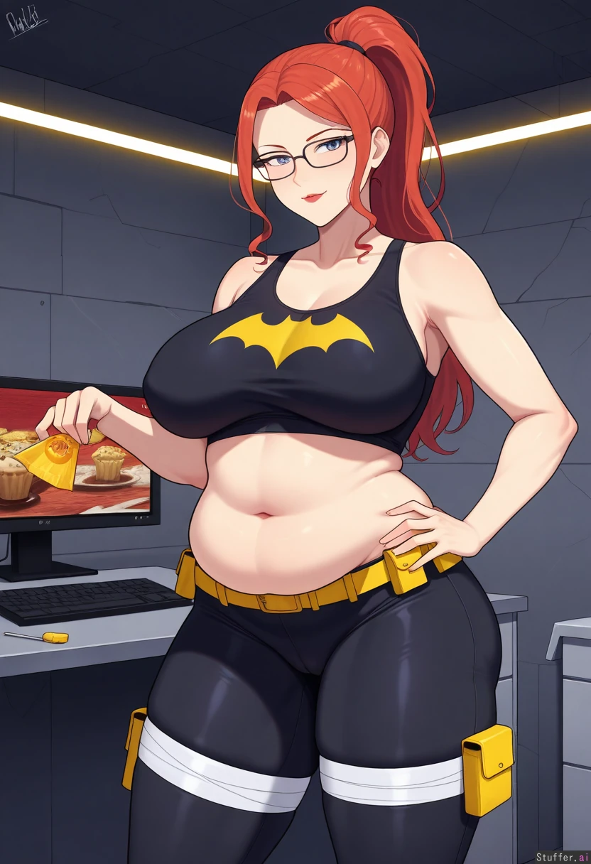 1girl, female, dc_comics, dc, batman_(series), no_cape, no_gloves, 1girl, tank_top, no_utility_belt, batgirl_(barbara_Gordon), (Barbara Gordon), batgirl, batgirl_(dc), no_mask, girl with blue eyes and red lipstick and red hair ponytail with bangs, female, blue_eyes, red_lipstick, long_hair, red_hair, bangs, redhead, mature_female, babe, hot body, pretty face, clothed_female, big_ass/butt/booty, front_side, front_view, forward_facing, gotham, cave, headquarters, batcave, large_computer, food_scraps, alone, solo, injured_leg, injury, bandaged_leg, leg_cast, wall_calender, blissful, empty_plate, food_wrapper, candy_wrapper, fast_food, thick_thighs, soft_arms, muffin_top, uterine_pouch, cameltoe, exposed_midriff, tight_yoga_pants, glasses, no_belt, bloated, holding_tummy, ((leg_thickness:0.9)) ((hip_width:1.2)) ((butt_size:0.9)) ((boob_size:0.6)) ((chubby_belly:1.2))