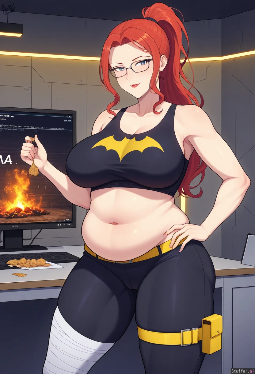 1girl, female, dc_comics, dc, batman_(series), no_cape, no_gloves, 1girl, tank_top, no_utility_belt, batgirl_(barbara_Gordon), (Barbara Gordon), batgirl, batgirl_(dc), no_mask, girl with blue eyes and red lipstick and red hair ponytail with bangs, female, blue_eyes, red_lipstick, long_hair, red_hair, bangs, redhead, mature_female, babe, hot body, pretty face, clothed_female, big_ass/butt/booty, front_side, front_view, forward_facing, gotham, cave, headquarters, batcave, large_computer, food_scraps, alone, solo, injured_leg, injury, bandaged_leg, leg_cast, wall_calender, blissful, empty_plate, food_wrapper, candy_wrapper, fast_food, thick_thighs, soft_arms, muffin_top, uterine_pouch, cameltoe, exposed_midriff, tight_yoga_pants, glasses, no_belt, bloated, holding_tummy, chubby_arms ((leg_thickness:1)) ((hip_width:1.3)) ((butt_size:0.9)) ((boob_size:0.6)) ((chubby_belly:1.3))