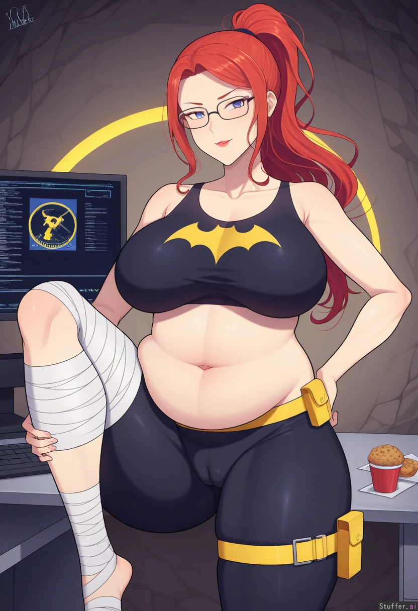 1girl, female, dc_comics, dc, batman_(series), no_cape, no_gloves, 1girl, tank_top, no_utility_belt, batgirl_(barbara_Gordon), (Barbara Gordon), batgirl, batgirl_(dc), no_mask, girl with blue eyes and red lipstick and red hair ponytail with bangs, female, blue_eyes, red_lipstick, long_hair, red_hair, bangs, redhead, mature_female, babe, hot body, pretty face, clothed_female, big_ass/butt/booty, front_side, front_view, forward_facing, gotham, cave, headquarters, batcave, large_computer, food_scraps, alone, solo, injured_leg, injury, bandaged_leg, leg_cast, wall_calender, blissful, empty_plate, food_wrapper, candy_wrapper, fast_food, thick_thighs, soft_arms, muffin_top, uterine_pouch, cameltoe, exposed_midriff, tight_yoga_pants, glasses, no_belt, bloated, holding_tummy, chubby_arms ((leg_thickness:1.2)) ((hip_width:1.5)) ((butt_size:1.1)) ((boob_size:0.6)) ((chubby_belly:1.3))