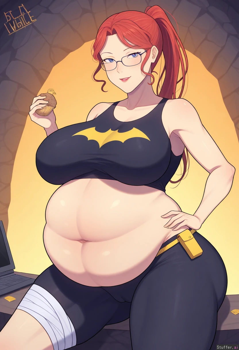 1girl, female, dc_comics, dc, batman_(series), no_cape, no_gloves, 1girl, tank_top, no_utility_belt, batgirl_(barbara_Gordon), (Barbara Gordon), batgirl, batgirl_(dc), no_mask, girl with blue eyes and red lipstick and red hair ponytail with bangs, female, blue_eyes, red_lipstick, long_hair, red_hair, bangs, redhead, mature_female, babe, hot body, pretty face, clothed_female, big_ass/butt/booty, front_side, front_view, forward_facing, gotham, cave, headquarters, batcave, large_computer, food_scraps, alone, solo, injured_leg, injury, bandaged_leg, leg_cast, wall_calender, blissful, empty_plate, food_wrapper, candy_wrapper, fast_food, thick_thighs, soft_arms, muffin_top, uterine_pouch, cameltoe, exposed_midriff, tight_yoga_pants, glasses, no_belt, bloated, holding_tummy, chubby_arms, sitting, fat, fat_hips, chubby_chheks ((leg_thickness:1.3)) ((hip_width:1.8)) ((butt_size:1.4)) ((boob_size:0.8)) ((chubby_belly:1.9))