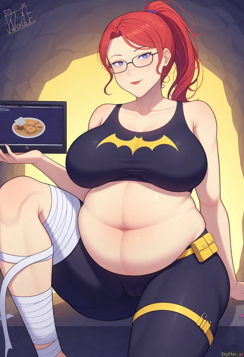 1girl, female, dc_comics, dc, batman_(series), no_cape, no_gloves, 1girl, tank_top, no_utility_belt, batgirl_(barbara_Gordon), (Barbara Gordon), batgirl, batgirl_(dc), no_mask, girl with blue eyes and red lipstick and red hair ponytail with bangs, female, blue_eyes, red_lipstick, long_hair, red_hair, bangs, redhead, mature_female, babe, hot body, pretty face, clothed_female, big_ass/butt/booty, front_side, front_view, forward_facing, gotham, cave, headquarters, batcave, large_computer, food_scraps, alone, solo, injured_leg, injury, bandaged_leg, leg_cast, wall_calender, blissful, empty_plate, food_wrapper, candy_wrapper, fast_food, thick_thighs, soft_arms, muffin_top, uterine_pouch, cameltoe, exposed_midriff, tight_yoga_pants, glasses, no_belt, bloated, holding_tummy, fat_arms, sitting, fat, fat_hips, fat_legs, chubby_cheeks ((leg_thickness:1.4)) ((hip_width:1.8)) ((butt_size:1.4)) ((boob_size:0.8)) ((chubby_belly:1.7))